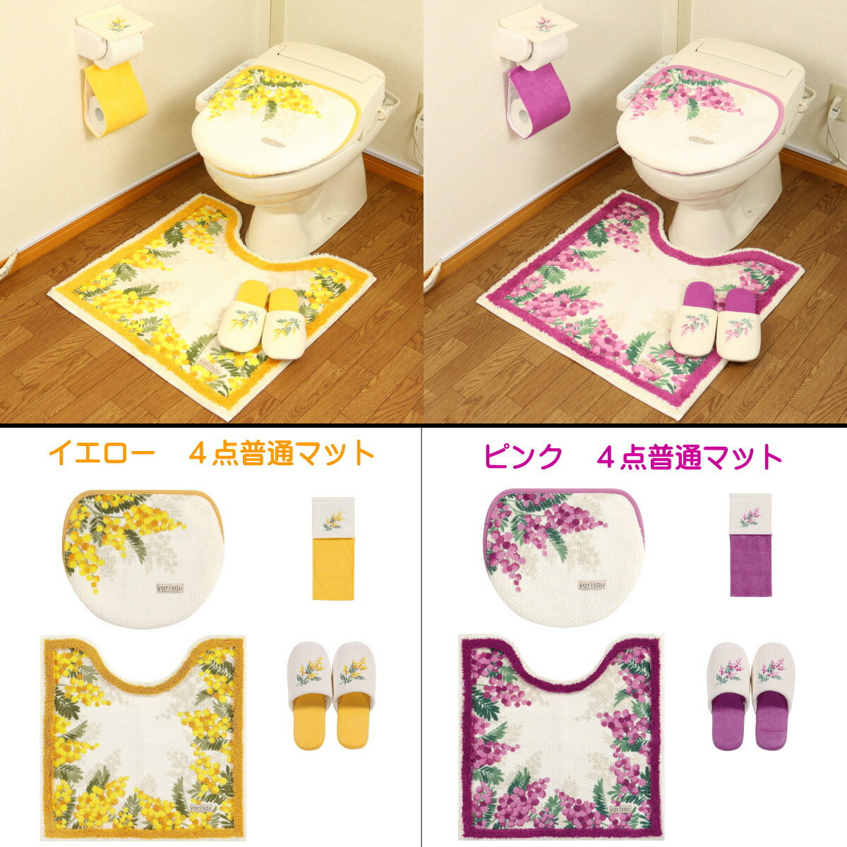 ※センコー ミモザ イエロー ※セット 1:共用ふたカバー 2:トイレマット(約60cm×60cm ) 3: ペーパーホルダーカバー 4:スリッパ ※商品詳細 1:ふたカバー:マルチタイプ(U・O・洗浄・暖房型兼用タイプ)/ 素材・材質:アクリル100% 抗菌・防臭吸水素材 / 生産国:日本 / 洗濯の際は洗濯用ネット使用(タンブラー乾燥不可) 2:トイレマット: サイズ:約60cm×60cm 首下:約50cm / 素材・材質:アクリル100%(抗菌・防臭吸水素材) / 生産国:日本 / 裏面すべりどめ加工 / 洗濯の際は洗濯用ネット使用(タンブラー乾燥不可) 3:ペーパーホルダーカバー: 素材・材質:表生地:パイル 綿・地糸 ポリエステル / 生産国:中国 / 洗濯の際は洗濯用ネット使用(タンブラー乾燥不可) 4:スリッパ: 素材・材質:甲・中板:パイル 綿・地糸 ポリエステル 抗菌・防臭吸水素材 / 生産国:中国 / 洗濯の際は洗濯用ネット使用(タンブラー乾燥不可) ※自動開閉機能付きのトイレでは自動開閉機能はお使いになれません。