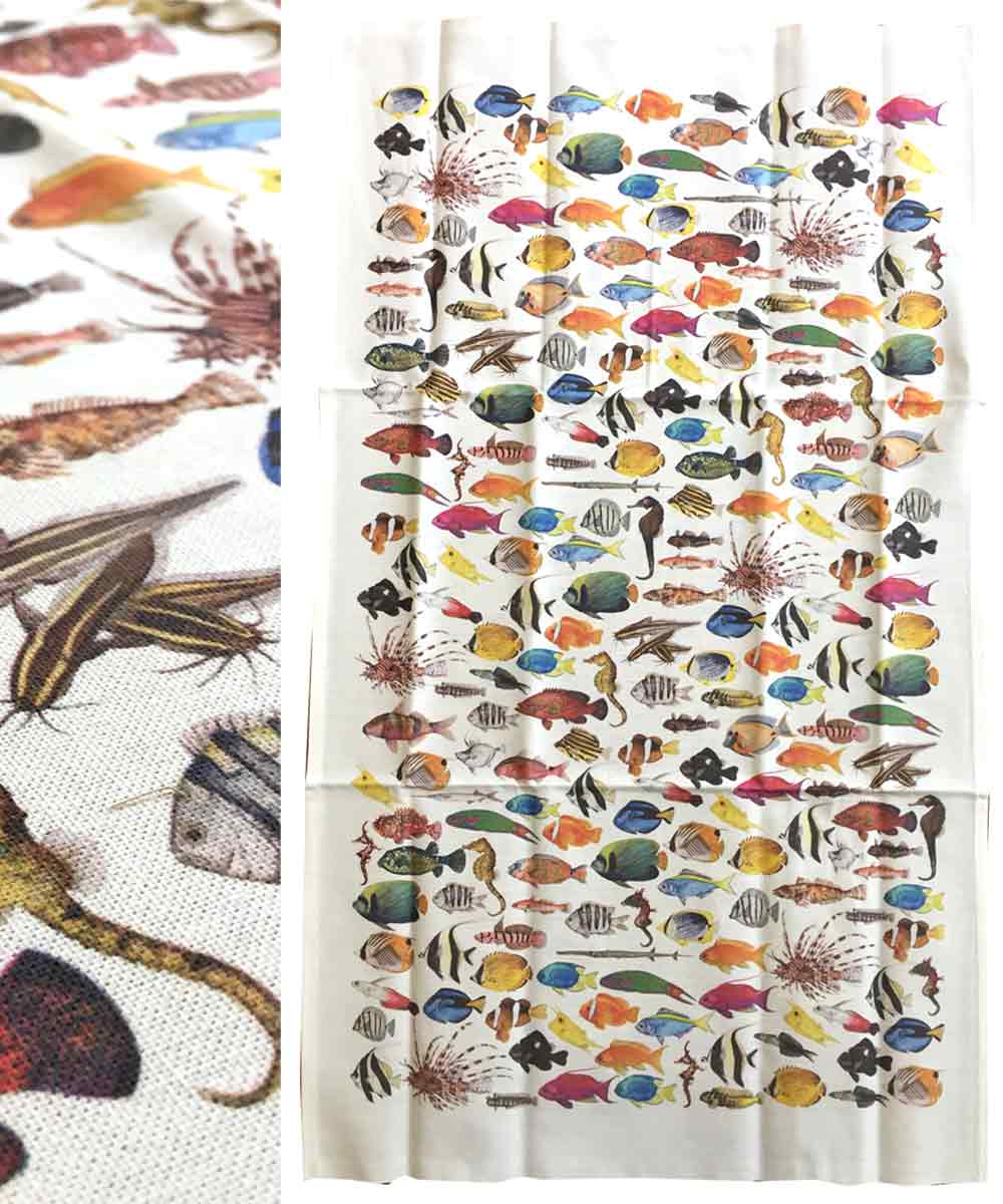 海から飛び出たかのように魚たちが躍動する、南伊豆在住のイギリス人画家によるリアルな水彩画のティータオルです。