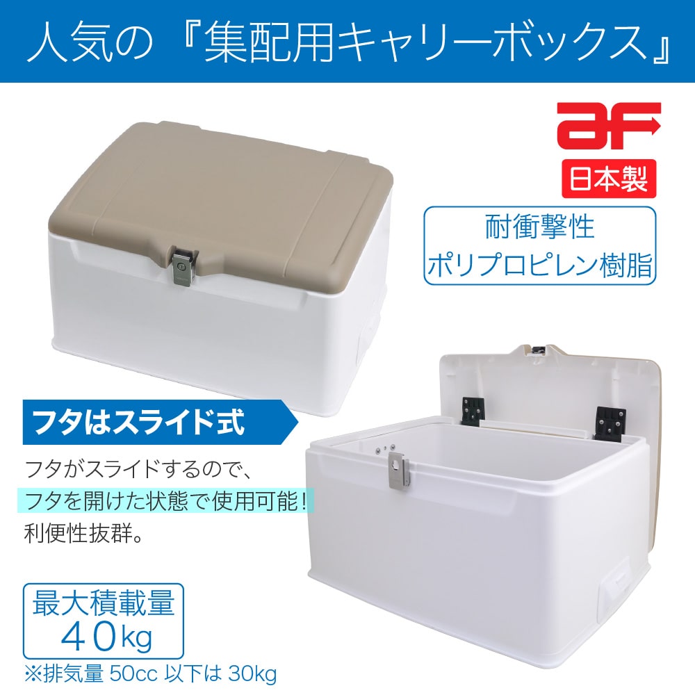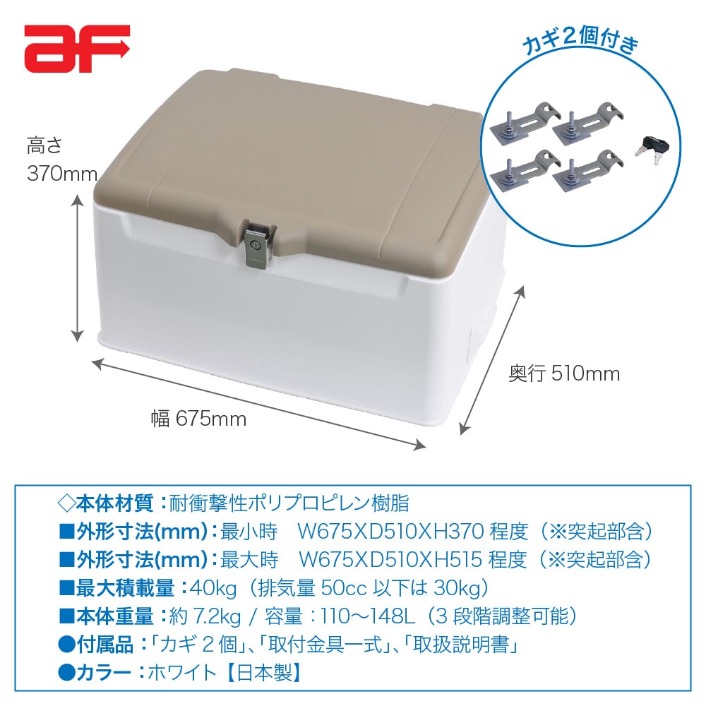 (以前は緩むことが無いようにすべて「リベット止め」でした) 【仕様一覧】 ◇本体材質:耐衝撃性ポリプロピレン樹脂 ■外形寸法(mm):最小時 W675XD510XH370程度(※突起部含) ■外形寸法(mm):最大時 W675XD510XH515程度(※突起部含) ■内寸/開口部(mm):W585XD425程度 ■内寸/最大部(mm):W625XD465程度 ■内寸/床面部(mm):W545XD410程度 ■最大積載量:40キロ(排気量50cc以下は30キロ) ■本体重量:約7.2キロ ●容量:110(最小時)〜148(最大時)リットル(3段階調整可能) ●付属品:カギ2個、取付金具一式(スーパーカブ用)、取扱説明書 ●カラー:ホワイト(ふたは「マットフレスコブラウン」) ●メーカー:旭精器製作所 ※ネットは別売りになります。