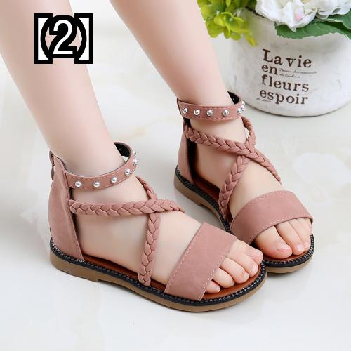 グラディエーター サンダル キッズ 女の子 フラット PU 柔らかい クロスストラップ 軽量 滑り止め 痛くない 履きやすい 通気性 プール 水遊び 海 かわいい 夏 編みこみ スタッズ ピンク 黒 緑