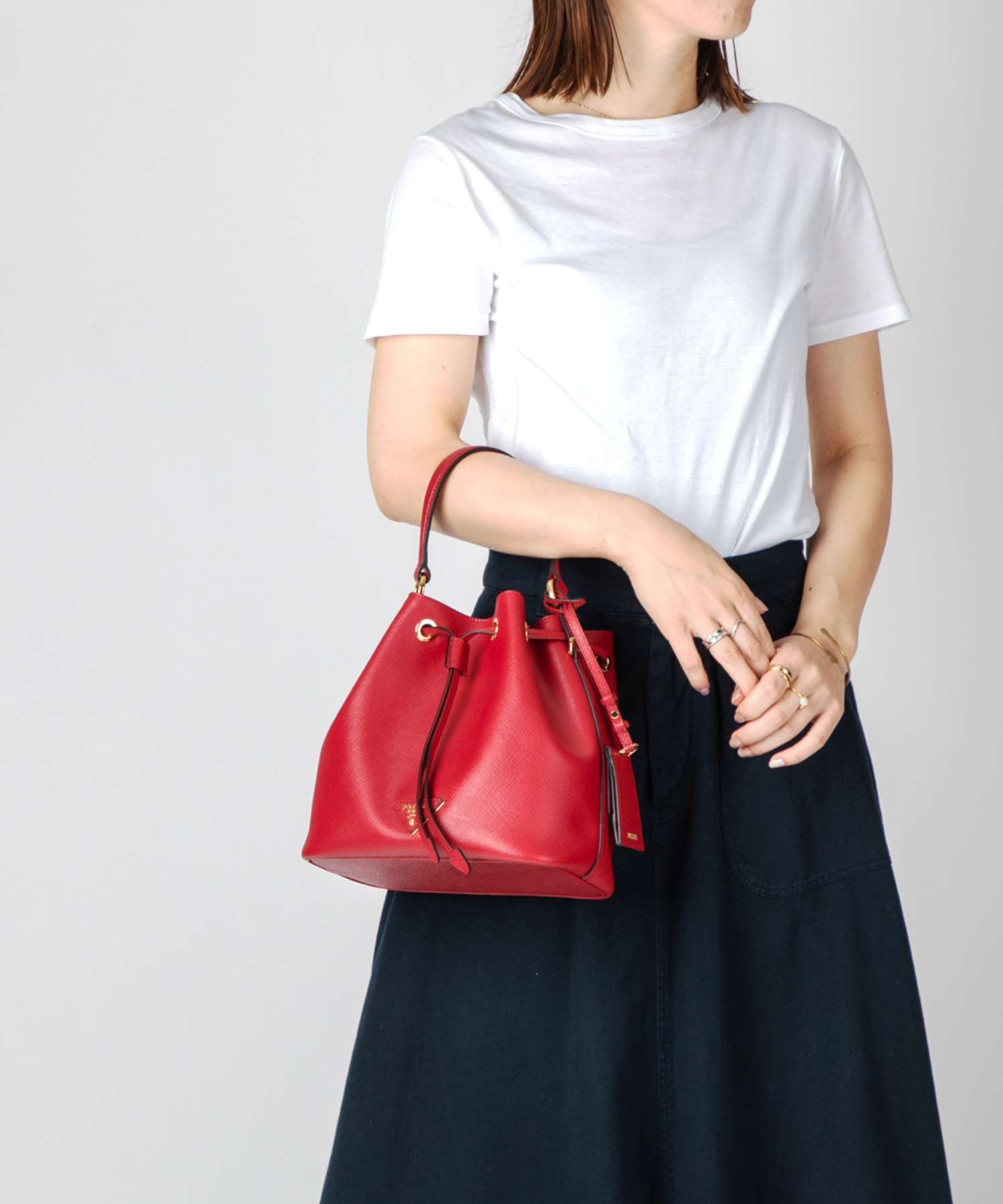 プラダ/PRADAハンドバッグ- レッド // FUOCO プラダ ハンドバッグ上質なレザーにゴールドレタリングロゴが印象的な巾着バッグ。